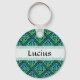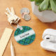 Un porte - clé rond d'un noeud bleu-vert celtique répéta la conception de carreaux de diamant contre un arrière - plan noir avec un nom personnalisable au milieu.