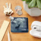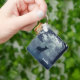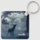 Porte - clé avec une photo d'un cerf royal aux bois de bois debout dans une forêt ombragée au milieu d'arbres éclairés par le soleil. Neige tombant tout autour.