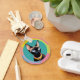 Gros plan d'un chat portant un collier, encadré dans un miroir circulaire contre un arrière - plan coloré, montrant ses yeux brillants et ses caractéristiques uniques.