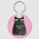 Fat de dessin animé noir gras aux yeux verts. Un joli personnage de chat. Porte - clés personnalisés avec effet d'impression ancien appliqués à l'image. Arrière - plan rose. Modifier le texte pour customiser. Idée cadeau pour les amoureux de les chats.