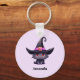 Un porte - clé avec une amusante illustration thématique Halloween pour les amoureux de les chats. Un gros chat noir aux yeux vêtu d'un grand casquette de sorcière noire avec une ceinture rose violet autour du bord.