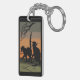 Cette image représente 2 chats noirs aux yeux brillants sur une parcelle d'herbe sous une branche d'un arbre mort. Le ciel à l'arrière est orange, et noir clair. Une bordure noire a été ajoutée. Ces porte - clés sont disponibles dans des styles et des tailles variés.