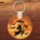 Sorcière et chauve-souris silhouettes contre la lune sur le noir.