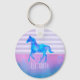 Porte - clé avec un joli cheval d'aquarelle aux couleurs bleu et violet. Courir sauvage et libre. Placez-vous sur un arrière - plan à rayures violettes horizontales avec un flair vintage. Une bordure d'aquarelle bleue et rose est superposée sur le fond.