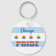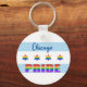 Ce design Chicago PRIDE combine les éléments du drapeau de Chicago avec les couleurs arc-en-ciel LBGTQ. Le mot Chicago est dans une police de type script bleu. Les quatre étoiles et le mot "PRIDE" sont dans les couleurs arc-en-ciel.