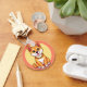 Illustration charmante d'un chiot de dessin animé mignon, assis sur un fond circulaire vibrant. Parfait pour les illustrations pour enfants, les thèmes pour animaux de compagnie et les conceptions joyeuses.