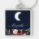 Porte-clés ciel nocturne bleu aquarelle avec étoiles et lune. Votre nom en écriture à la mode. Comprend des fleurs aquarelles. Roses bordeaux, fleurs rouges, roses roses, fleurs bleues et verdure botanique.