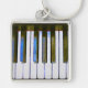 Étude en bleu - L'œuvre originale de ZoeSPEAK sur ce porte-clés est un gros plan d'un clavier de piano, avec une mise en évidence bleu électrique sur les touches noires du piano, et des reflets des touches dans le bois brun foncé à l'arrière. Une fine ligne de rouge doux sépare le bois des touches.