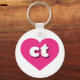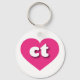 Ce porte - clé est doté d'un coeur rose vif et brillant, contenant les lettres coques inférieures blanches, arrondies et audacieuses ct, une version ludique de l'abréviation Connecticut, l'état de la constitution.