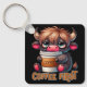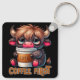 A funny and sarcastic design showcases a cute highland cow holding a to-go coffee cup brimming with coffee. With big blue eyes and a sleepy, tired expression, the cow rests its head on the cup's lid, its fluffy black fur adding to the charm. The colorful text reads, "Coffee first." This playful design is available on a wide variety of products, making perfect gifts for coffee lovers.