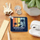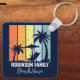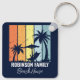 Maison de plage bleu marine personnalisée porte - clé pour votre maison familiale à Hawaii, en Floride, ou d'autres destinations des îles tropicales. Les palmiers cool se dressent contre les couleurs rétro de l'orange et du jaune au-dessus de votre nom de vacances customisé en écriture blanche. Idéal pour un groupe qui part en croisière ou en escapade côtière.