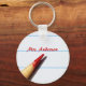 Un porte - clé de style manuscrit avec un crayon de correction de couleur rouge vif posé sur une feuille blanche de papier d'école doublé. Personnalisez ce design scolastique en signant votre nom. Parfait pour les écrivains, les enseignants ou les élèves du collège ou du lycée.