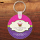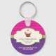 This bright and whimsical cupcake keychain is sure to get attention. The cream colored frame holds the chocolate cherry-topped cupcake with pink and white frosting and a business name and description. It sits against a colorful pink chevron and purple polka dot background. Add main contact information below. Great for promotional use. Available in alternate colors with matching products.