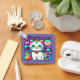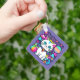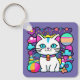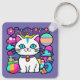Adorable porte - clé avec un mignon chat kitty caricaturé blanc, fantaisiste, avec de grands yeux bleus, des oreilles roses et portant un collier brillant et coloré. Elle a une jolie queue rayée bleue, rose et blanche et une bande bleue sur la tête. L'arrière - plan est principalement violet avec des planètes, des nuages, des étoiles et des fleurs dans un mélange de couleurs audacieuses, vives et vives. Idéal pour tous ceux qui aiment les chats et l'espace.