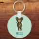A personalized keychain with a simple illustration of a cartoon brown bear holding a yellow daisy. Hello written above his head.