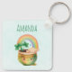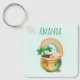A key chain with an adorable illustration featuring a smiling green and gold pot with a cute rainbow,