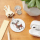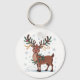A cartoon illustration of a happy reindeer with a bright red nose and brown fur standing against a white background with scattered light blue snowflakes. The reindeer has large antlers decorated with green pine branches, red berries, and golden ribbons that curl and flow. The antlers extend outward in a symmetrical pattern. The reindeer's expression shows a wide smile with small white teeth, large round black eyes, and small white dots on its face. The body is decorated with green pine garlands containing red berries wrapped around its neck and body. The legs are short and sturdy with small hooves, and the tail is bushy with white tips. The illustration has a whimsical, festive quality with a clean, digital art style. The snow effect is created with simple, geometric snowflake patterns in varying sizes scattered throughout the background.