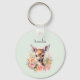 Porte - clé avec une belle illustration représentant un cerf mignon. Entouré de roses roses et de fleurs roses.