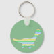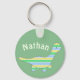 Dinosaure de dessin animé rayé vert et bleu sur le porte - clé de bouton personnalisé de mignon enfant.