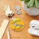 This is an agility themed keychain with a bright yellow background, featuring a dog going over the A-frame, with the text, “Agility Makes My Dog Smile!”.