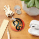 Ce dragon tribal noir est assis sur un arrière - plan rouge et jaune vif. Le soleil apparaît juste derrière la tête du dragon qui se dresse face à lui dans une pose élégante. Le corps du serpent s’agenouille et recule avec ses grandes ailes noires s’étendant vers l’extérieur. Ce motif étonnant fait un porte - clé magnifique.