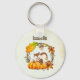 Porte - clé personnalisé avec un mignon écureuil debout derrière quelques citrouilles orange aquarelle. Une couronne de feuillage les entoure d'une feuille de chêne et de fleurs d'orange et d'autres sprigs et feuilles. L'Arrière - plan est de couleur crème, avec un aspect vieillot rugueux autour des bords.