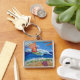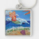 Le tableau montre un ange surfeur orange brillant sur un océan bleu au soleil étincelant. De la mousse de mer se lave sur le sable entourant les mots "Effacer le cancer". Une coquille rose est installée sur la plage. La peinture a été rendue en acrylique et parsemée de parties scintillant pour la texture et la brillance. Personnalisez ce porte - clé avec vos propres images et messages en utilisant le bouton "Customiser".