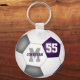Cette équipe colorant le porte - clé de football pour les garçons ou les filles dispose d'une balle de football de style traditionnel avec des panneaux violets, gris et blancs - customisez le nom du joueur, le monogramme et le numéro de maillot - par katz_d_zynes