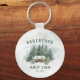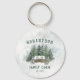 Ce porte - clé cabine familial personnalisé présente une scène aquarelle rustique d'un cabine niché dans la forêt de pins enneigés, avec nom de famille et année établie.