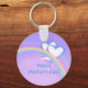 Joli porte - clé avec une image de deux coeurs blancs et bleus sur un arc-en-ciel dans un ciel violet.