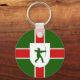 Keychain with design with a flag of historic county of Nottinghamshire, in England, Great Britain; green flag with a red cross, with inescutcheon with illustration of Robin Hood in the centre