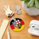 Button Keychain with flag of Saarland; design with horizontal tricolor of black, red and yellow (golden), with state’s coat of arms in the center