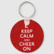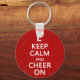 Restez calme et acclamez, amusez porte - clé pom-pom girl avec un arrière - plan rouge, un texte blanc, et une fille joyeuse sautant avec des pom-poms. Idéal pour une équipe, un groupe ou un événement pour les jeunes.