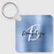 This elegant personalized keychain features a monogram and first name in modern black and white script on a glam blue faux brushed metal background.