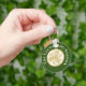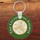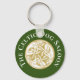 Porte - clé avec texte personnalisable et centre complexe doré et blanc chien celtique en forme de disque sur arrière - plan vert.