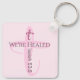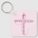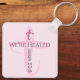Ce porte - clé présente une croix rose pâle avec un verset de la Bible qui guérit. Le texte est personnalisable.
