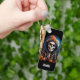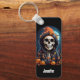 Porte - clé personnalisé avec l'illustration d'un squelette portant une veste à capuchon avec un casquette de sorcière orange au-dessus. Entouré de citrouilles mignons et éffrayants. Une lune brillante dans le dos avec une seule chauve-souris volant à proximité. Fun automne design Halloween.