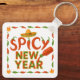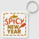 Fun holiday keychain, "Seasoned Greetings" with salt and pepper shakers and personalize it with chef's name for the cook you love and appreciate. Festive holly, spoon and fork frame the wording on this festive design. Cute "Spicy New Year" red and green chili pepper design on back!