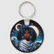 A fun horoscope sign Aquarius key chain with a pretty celestial illustration of a water bearer African-American woman in front of stars and a full moon/