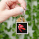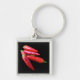This keychain features brilliant scarlet red hot chili peppers on a pure black background.