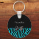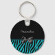 Un porte - clé d'impression zèbre mignon et tendance avec des rayures de zèbre noir et turquoise modernes et orné d'un ruban noir ceint imprimé. Personnalisez en ajoutant votre nom à ce design féminin noir et turquoise chic. Parfait pour la fashionista stylisée dans n'importe quelle fille ado!