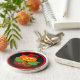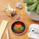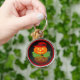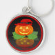 C'est une image d'un Jack-o'-lantern tout habillé. Un citrouille orange avec un casquette aux sorcières rouges est assis sur un lit de feuilles verts. La Jack-o'-lantern est éclairée par des yeux brillants et un sourire. Un fond noir a également été ajouté pour que vous puissiez voir sa réflexion. Une bordure rouge a été ajoutée. Ces porte - clés sont disponibles dans des styles et des tailles variés.