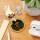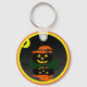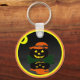 C'est une image d'un Jack-o'-lantern tout habillé. Un citrouille noir avec un casquette aux sorcières orange est assis sur un lit de feuilles verts. La Jack-o'-lantern est éclairée par des yeux brillants et un sourire. Un fond noir a été ajouté pour que vous puissiez voir sa réflexion. Les porte - clés sont disponibles en styles et tailles assortis.