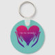 Ce porte - clé possède un grand coeur rose tenu en 2 mains sur un arrière - plan bleu aqua serein.