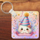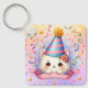Célébrez avec style cet adorable porte - clé de chat portant un casquette de fête d'anniversaire ! Parfait pour les amoureux de les chats qui aiment les modèles kawaii mignons. Ajoutez une touche de fantaisie à votre journée avec des confettis et des arrière - plans de parties scintillant pastel.