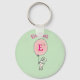 Un porte - clé avec un lapin géant tenant un gros ballon rose flottant dans l'air. Placez-vous sur un arrière - plan vert clair. Personnalisez avec un nom et un monogramme initial.
