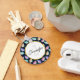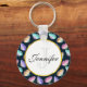 Un porte - clé avec un beau motif. Papillons aquarelles, peints dans des couleurs pastel, rose, violet, bleu, jaune et vert. Arrière - plan d'aquarelle bleu foncé. Placez votre nom et votre lettre monogramme à l'intérieur d'un cercle blanc avec une bordure en feuille d'or.