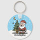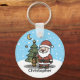 Ajoutez votre nom pour personnaliser ce joli porte-clés de Noël au Père Noël. Répandez la joie des fêtes avec ce mignon Père Noël de dessin animé portant un chapeau et un costume de Père Noël rouge et blanc, debout à côté d'un sapin de Noël vert orné de lumières colorées et d'une étoile jaune. Il tient une lanterne pour éclairer la scène hivernale enneigée. Sous l'illustration se trouve un modèle pour ajouter votre nom pour personnaliser.