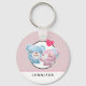 Porte - clé personnalisée avec une jolie image de dessin animé d'un couple d'ours, l'ours est rose pastel avec un petit arc et elle embrasse la joue d'un ours bleu qui semble ravi. Un petit coeur rose flotte au-dessus de leur tête. Très mignon et kawaii. motif Arrière - plan est une couleur rose muet avec des pois blancs.