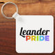 New Leander Pride logo keychain with black and rainbow lettering on white background